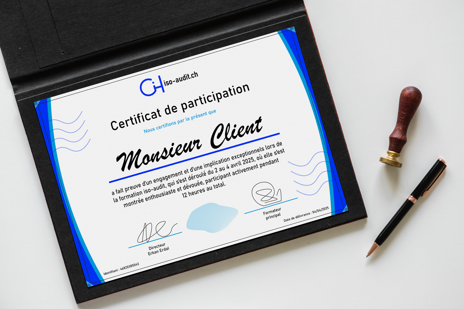 Chaque participant reçoit un certificat iso-audit.ch attestant de ses compétences et de sa participation active. Ce document est reconnu par les entreprises, et il représente un véritable atout pour ton parcours professionnel.